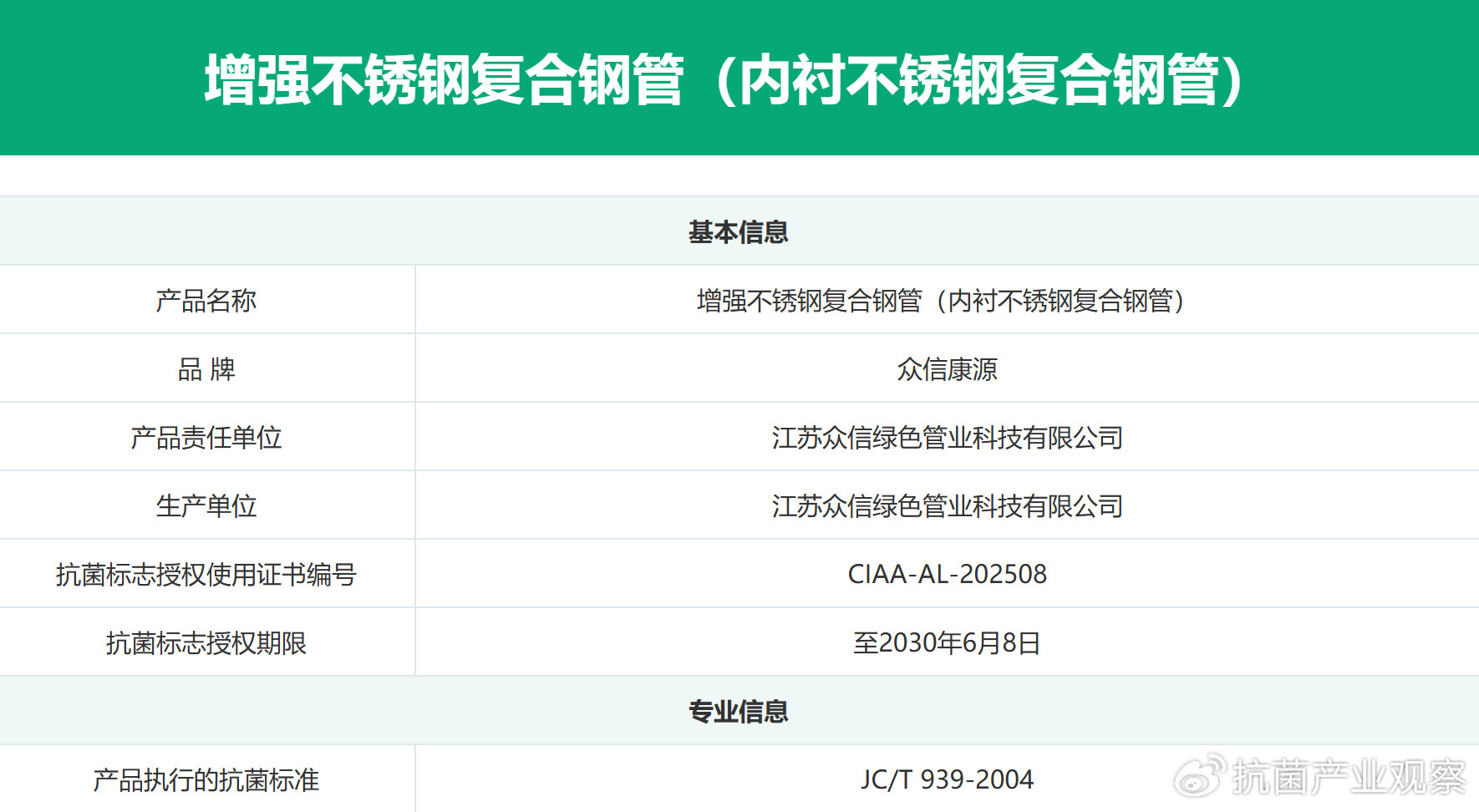 日前,江蘇眾信綠色管業(yè)科技有限公司研發(fā)生產(chǎn)的增強不銹鋼復合鋼管(內(nèi)襯不銹鋼復合鋼管)通過CIAA的嚴苛審核,獲得抗菌標志使用授權(quán)。增強不銹鋼復合鋼管(內(nèi)襯不銹鋼復合鋼管)獲得抗菌標志使用授權(quán),這意味著其衛(wèi)生安全性能和抗菌性能達到業(yè)界最高技術(shù)追求,成為CIAA推薦的“安全且抗菌有效”的抗菌標志產(chǎn)品。