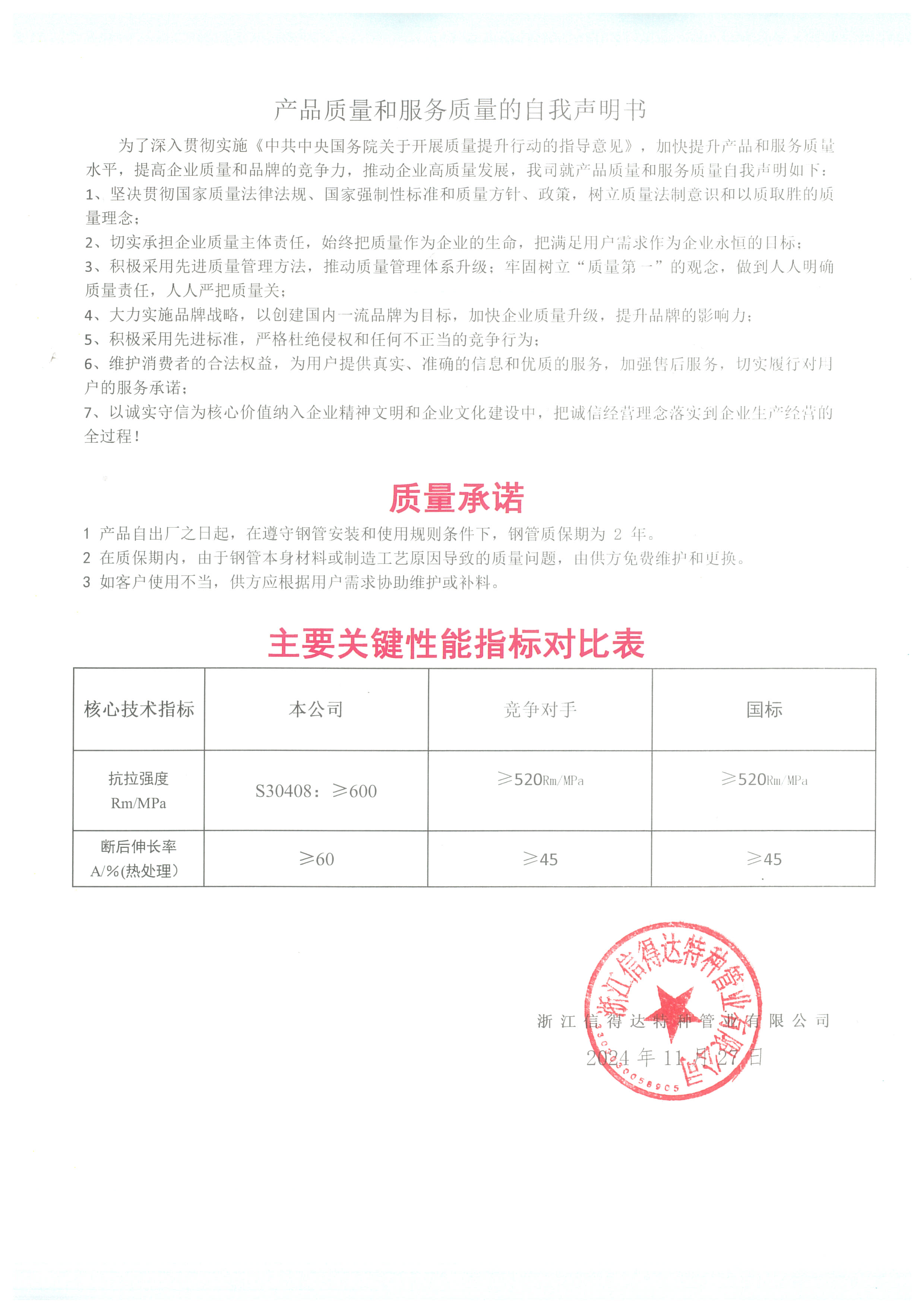 產(chǎn)品質(zhì)量和服務(wù)質(zhì)量的自我聲明書